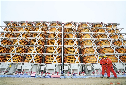 中石化重慶頁巖氣有限公司勝頁2壓裂試氣與鉆井同平臺井場內(nèi),兩名石油工人在工作。日前,位于重慶市南川區(qū)新冠肺炎疫情低風(fēng)險區(qū)域的中石化重慶頁巖氣有限公司14個頁巖氣開采作業(yè)點(diǎn)全面恢復(fù)頁巖氣開采作業(yè),有力保障了下游工業(yè)企業(yè)復(fù)工復(fù)產(chǎn)用氣需要。新華社記者 劉 潺攝