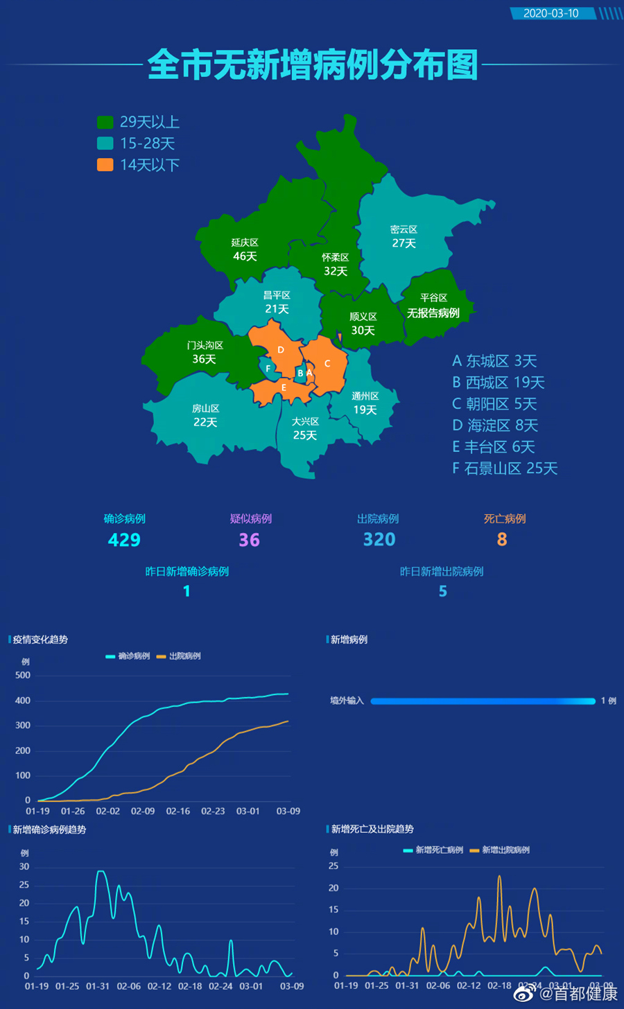 截至3月9日24時,累計確診病例429例,治愈出院病例320例,死亡病例8例?,F(xiàn)有疑似病例36例。累計確定密切接觸者3650人,其中467人尚在隔離醫(yī)學(xué)觀察中。確診病例中東城區(qū)14例、西城區(qū)53例、朝陽區(qū)72例、海淀區(qū)63例、豐臺區(qū)43例、石景山區(qū)14例、門頭溝3例、房山區(qū)16例、通州區(qū)19例、順義區(qū)10例、昌平區(qū)29例、大興區(qū)39例、懷柔區(qū)7例、密云區(qū)7例、延慶區(qū)1例,平谷區(qū)尚未有病例,外地來京病例25例,境外輸入病例14例。