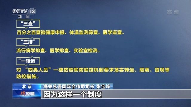 海關(guān)總署國際合作司司長 張寶峰:“三查”“三排”“一轉(zhuǎn)運(yùn)”是我們海關(guān)多年來摸索探索形成的一個比較成熟的、規(guī)范的應(yīng)對重大國外疫情傳入的制度模式。運(yùn)行這個模式,主要有三個方面,第一就是海關(guān)的執(zhí)行,海關(guān)在執(zhí)行方面我們是非常有信心的。