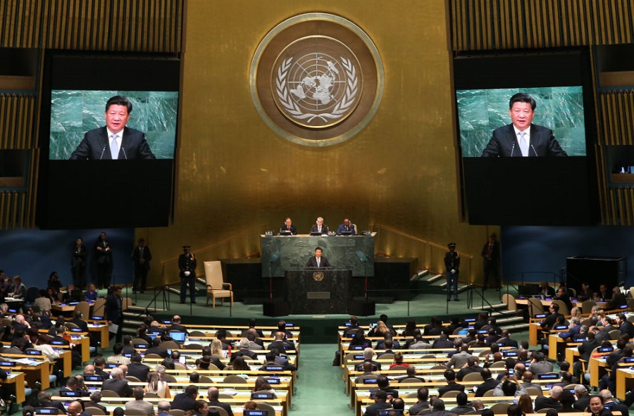 2015年9月28日,國家主席習近平在紐約聯(lián)合國總部出席第70屆聯(lián)合國大會一般性辯論并發(fā)表題為《攜手構(gòu)建合作共贏新伙伴 同心打造人類命運共同體》的重要講話。新華社記者龐興雷攝