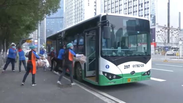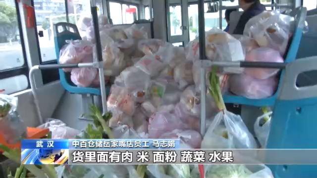 十點(diǎn)整,運(yùn)送1500包愛(ài)心菜和500多包其它生活物資的專車來(lái)了:一輛297路公交車。為了提高運(yùn)輸效率,武漢市公交集團(tuán)承接了全市社區(qū)團(tuán)購(gòu)的集中配送任務(wù)。幾十名超市員工組成“人力傳送帶”把物資送上車。很快,公交車出發(fā)了。
