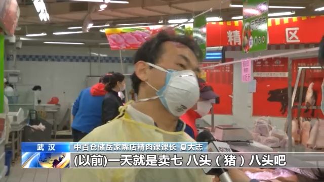 中百倉(cāng)儲(chǔ)岳家嘴店精肉課課長(zhǎng) 夏大志:以前賣8頭豬16片,現(xiàn)在賣15頭 30片,冷凍肉一天要賣一兩噸,箱子裝的100多箱。