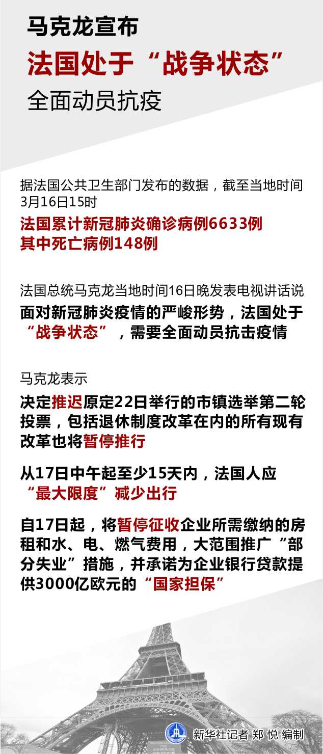 新華社巴黎3月16日電(記者徐永春 唐霽 陳晨)法國(guó)總統(tǒng)馬克龍16日晚發(fā)表電視講話說,面對(duì)新冠肺炎疫情的嚴(yán)峻形勢(shì),法國(guó)處于“戰(zhàn)爭(zhēng)狀態(tài)”,需要全面動(dòng)員抗擊疫情。