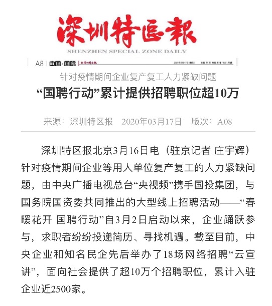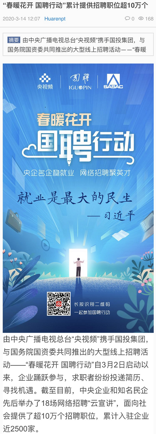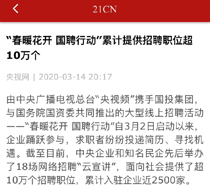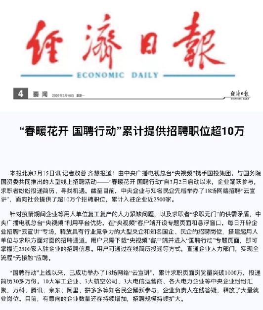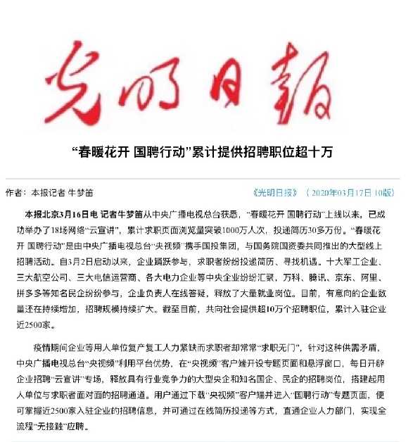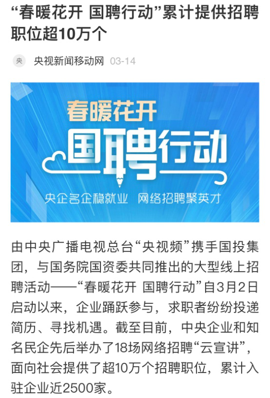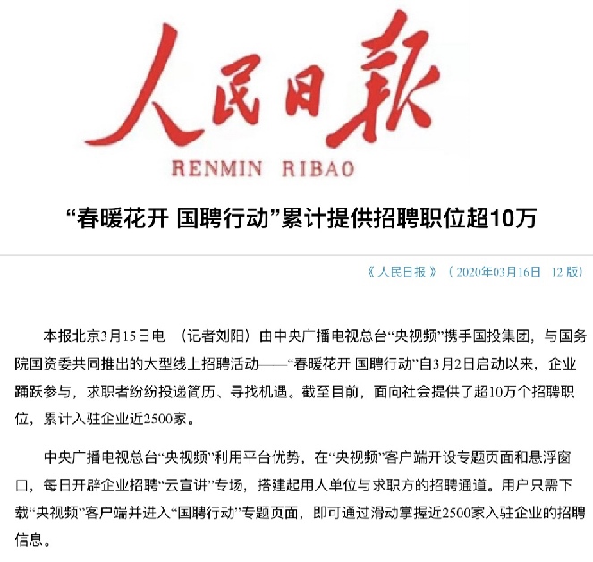 由中央廣播電視總臺“央視頻”攜手國投集團,與國務院國資委共同推出的大型線上招聘活動——“春暖花開 國聘行動”,自3月2日啟動以來,企業(yè)踴躍參與,求職者紛紛投遞簡歷。截至3月14日已面向社會提供了超10萬個招聘職位,累計入駐企業(yè)近2500家,引發(fā)眾多媒體和網(wǎng)站轉載報道。