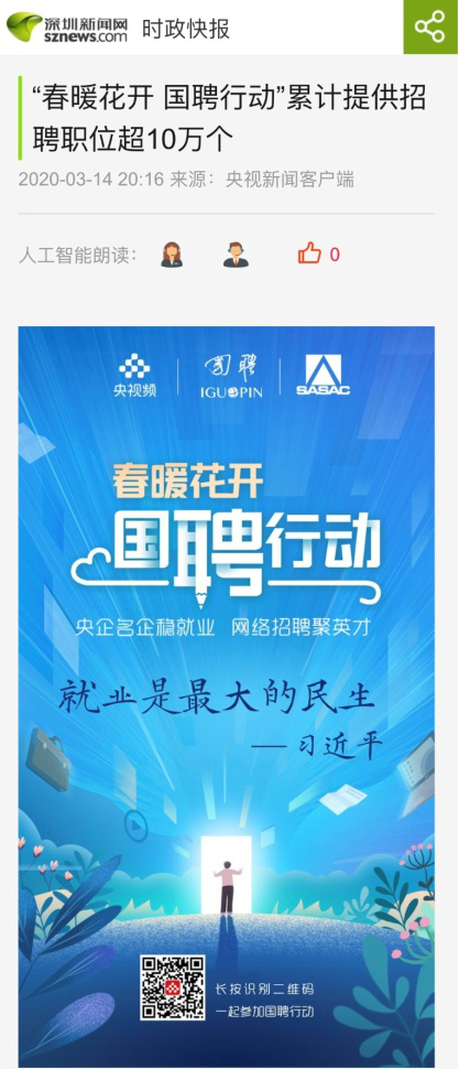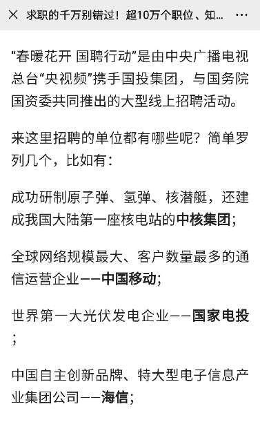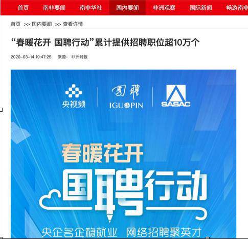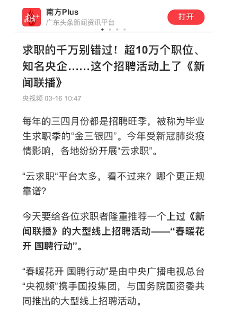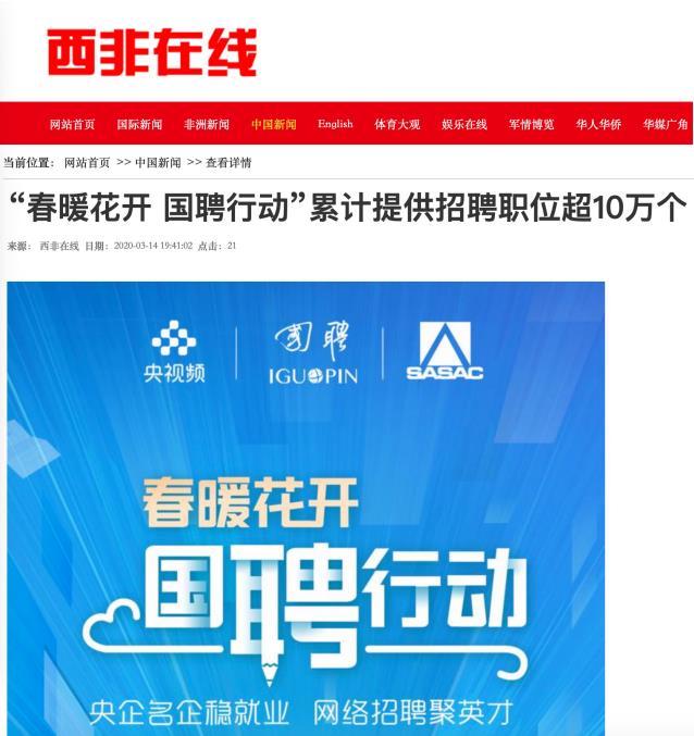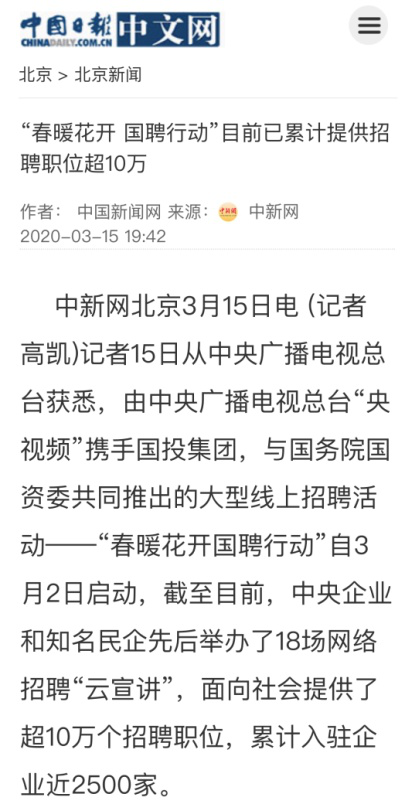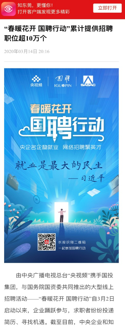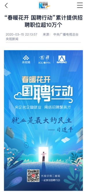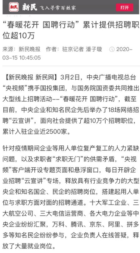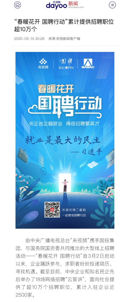 由中央廣播電視總臺“央視頻”攜手國投集團,與國務院國資委共同推出的大型線上招聘活動——“春暖花開 國聘行動”,自3月2日啟動以來,企業(yè)踴躍參與,求職者紛紛投遞簡歷。截至3月14日已面向社會提供了超10萬個招聘職位,累計入駐企業(yè)近2500家,引發(fā)眾多媒體和網(wǎng)站轉載報道。
