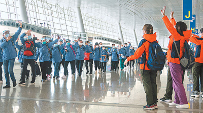 3月17日,在武漢天河機場,山東國家緊急醫(yī)學救援隊隊員(左側)向江蘇國家緊急醫(yī)學救援隊隊員揮手致意。新華社記者 熊琦攝