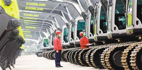 位于陜西省渭南高新區(qū)的中聯(lián)重科渭南工業(yè)園內(nèi),檢驗(yàn)人員對即將出廠的挖掘機(jī)檢查驗(yàn)收。崔正博攝(中經(jīng)視覺)