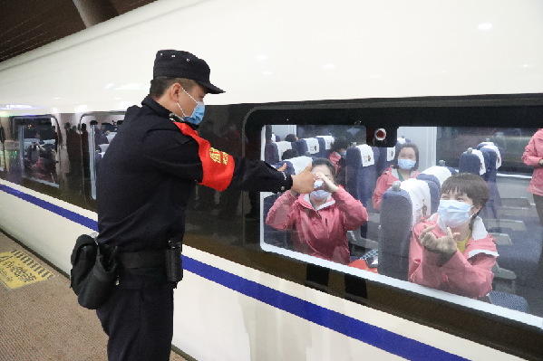 隨著疫情防控形勢逐步轉(zhuǎn)好,完成救助任務的各地馳援醫(yī)療隊將分批有序撤離。當日,來自貴州、湖南、河南三省的484名援鄂醫(yī)護人員分8批次,分別乘坐5趟高鐵踏上回家的路程,在武漢火車站,鐵路民警、車站工作人員和志愿者們在進站口、候車室、站臺上歡送這群最美麗的“白衣天使”。
