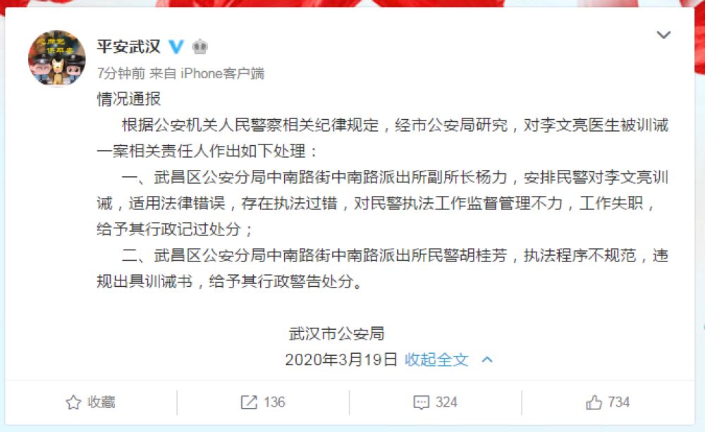 根據(jù)公安機(jī)關(guān)人民警察相關(guān)紀(jì)律規(guī)定,經(jīng)市公安局研究,對李文亮醫(yī)生被訓(xùn)誡一案相關(guān)責(zé)任人作出如下處理: