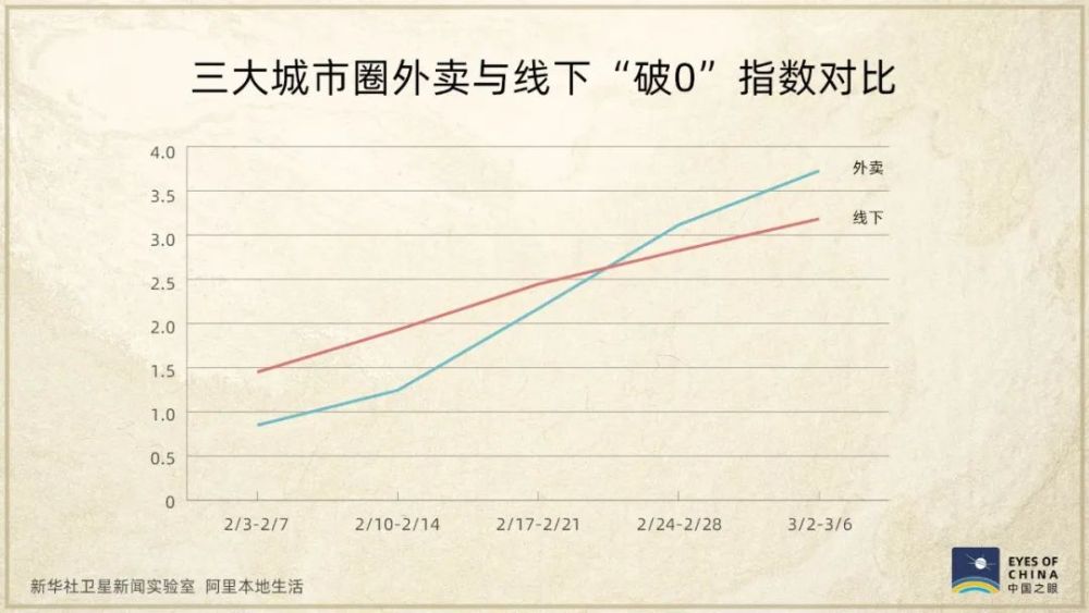 2月初,三大城市圈通過外賣恢復(fù)營業(yè)的商家數(shù)量少于線下恢復(fù)營業(yè)的數(shù)量。而到3月初,更多商家通過線上外賣服務(wù)恢復(fù)營業(yè)并獲得收入?!靶禄ā敝?“新服務(wù)”,在保障人民生活以及商業(yè)恢復(fù)的過程中發(fā)力明顯。