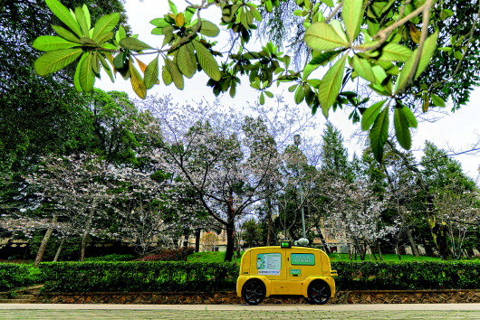 ▲一輛5G無(wú)人攝像車(chē)在武漢大學(xué)櫻花大道進(jìn)行不間斷無(wú)人巡游,實(shí)時(shí)采集和傳輸直播圖像信號(hào)。(3月16日攝) 新華社記者費(fèi)茂華攝