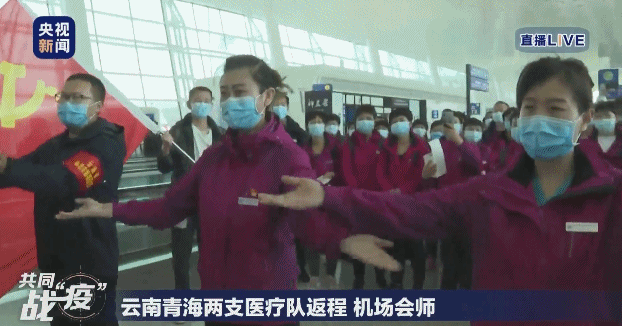 唱響《歌唱祖國(guó)》的兩支隊(duì)伍是云南第七批支援武漢醫(yī)療隊(duì)和青海第一批支援武漢醫(yī)療隊(duì)。合唱結(jié)束,兩隊(duì)隊(duì)員還唱起了家鄉(xiāng)民歌,跳起《聽我說(shuō)謝謝你》的舞蹈。