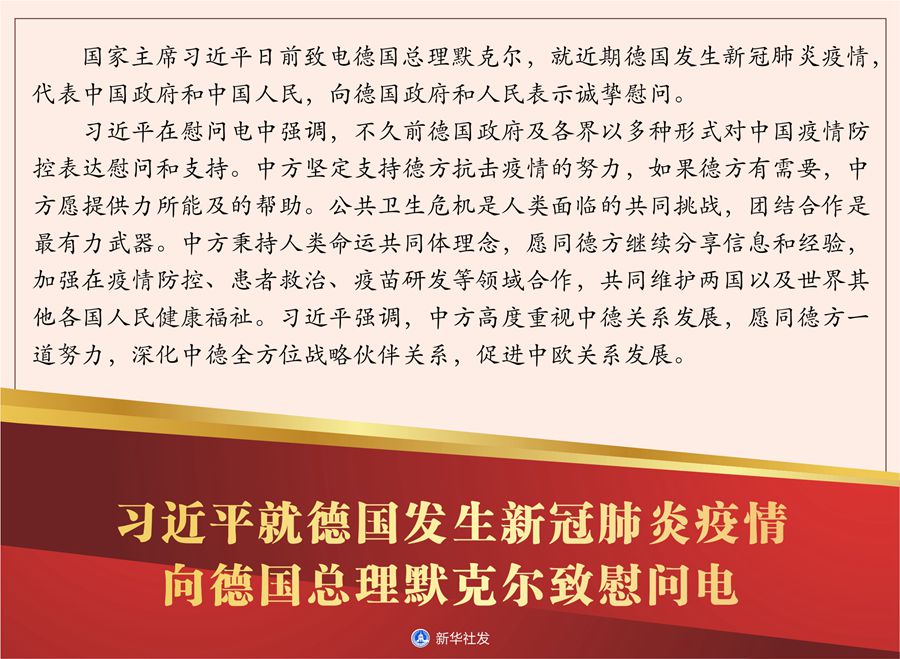 習近平在慰問電中強調,不久前德國政府及各界以多種形式對中國疫情防控表達慰問和支持。中方堅定支持德方抗擊疫情的努力,如果德方有需要,中方愿提供力所能及的幫助。公共衛(wèi)生危機是人類面臨的共同挑戰(zhàn),團結合作是最有力武器。中方秉持人類命運共同體理念,愿同德方繼續(xù)分享信息和經驗,加強在疫情防控、患者救治、疫苗研發(fā)等領域合作,共同維護兩國以及世界其他各國人民健康福祉。習近平強調,中方高度重視中德關系發(fā)展,愿同德方一道努力,深化中德全方位戰(zhàn)略伙伴關系,促進中歐關系發(fā)展。