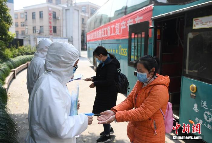 3月19日,湖北恩施復(fù)工人員到達杭州洲際食品有限公司后進行防疫消毒。當日,來自湖北省恩施州的首批146名赴杭州復(fù)工人員抵達浙江杭州。 中新社記者 王剛 攝
