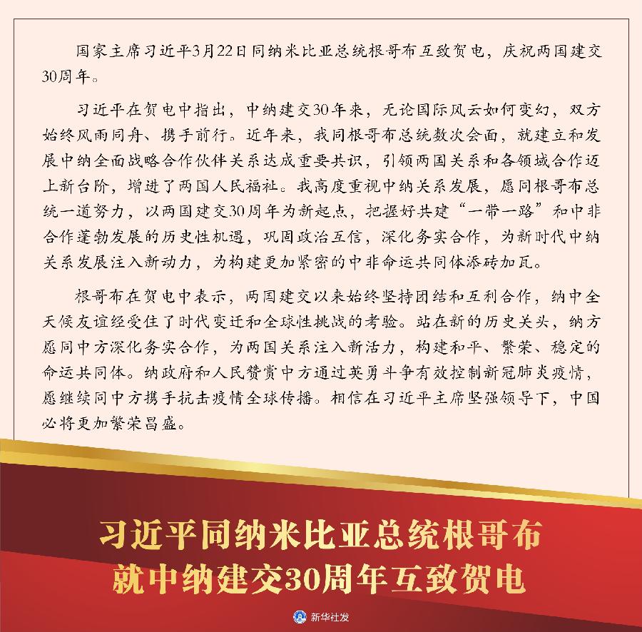 新華社北京3月22日電 國家主席習(xí)近平3月22日同納米比亞總統(tǒng)根哥布互致賀電,慶祝兩國建交30周年。