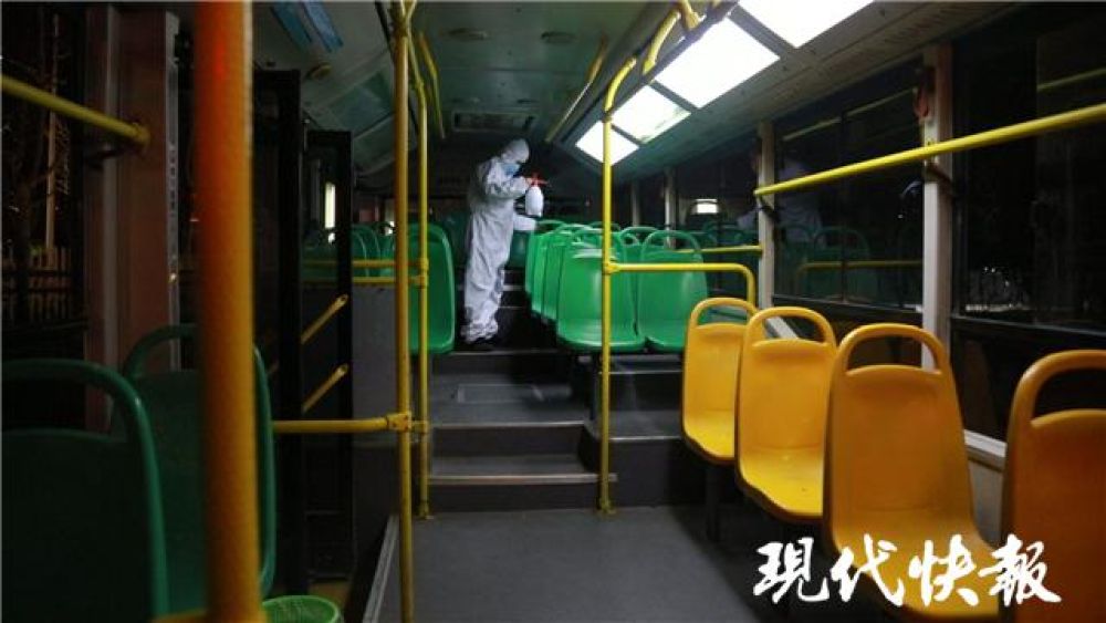 3月18日晚上8點(diǎn),穿好防護(hù)服的陳強(qiáng)開始對(duì)405路公交車進(jìn)行全方位消毒,車身、扶手、座位,任何一個(gè)角落都不放過。