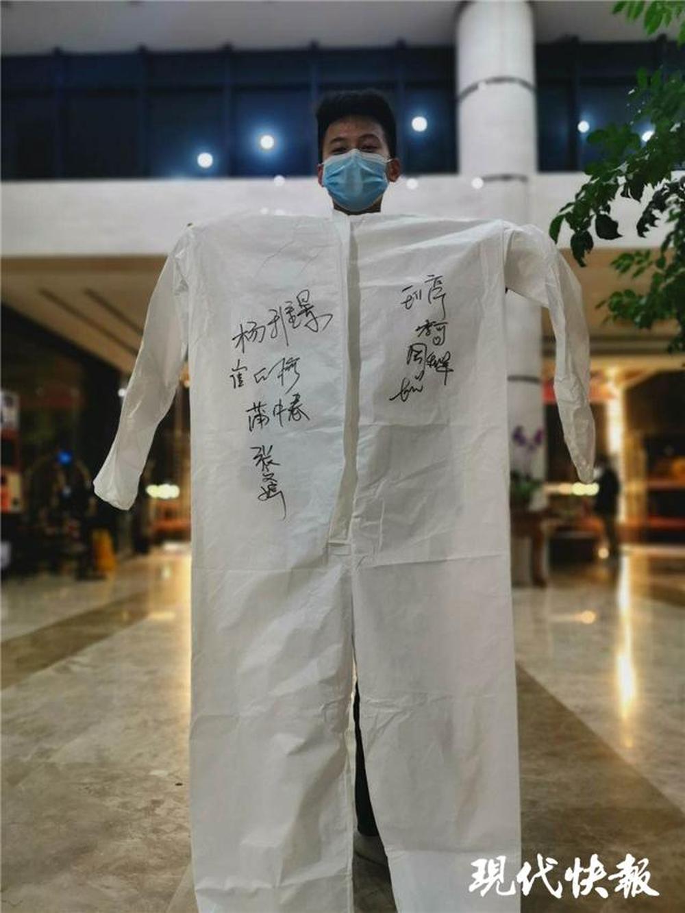 “其實(shí)他們都比我大,叫我強(qiáng)哥都不敢應(yīng)?!标悘?qiáng)靦腆地笑著。陳強(qiáng)還展示了一件特殊的防護(hù)服,上面寫滿了他接送的醫(yī)護(hù)人員名字?!拔蚁M词顾麄冏吡?,我也能記得他們。”