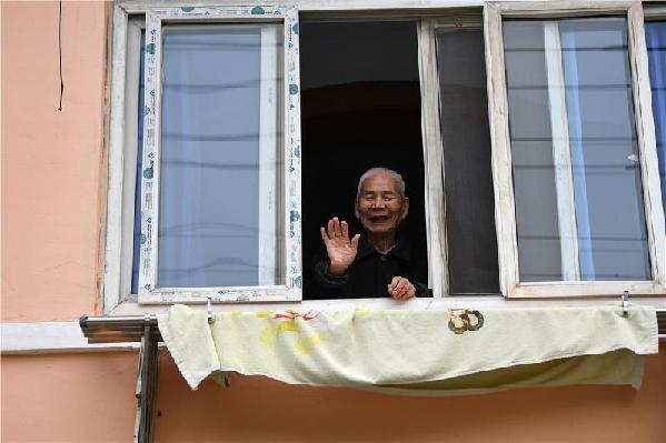 3月23日,武漢市青山區(qū)青山鎮(zhèn)街船廠社區(qū),一位爹爹在自家窗口和網(wǎng)格員打招呼。