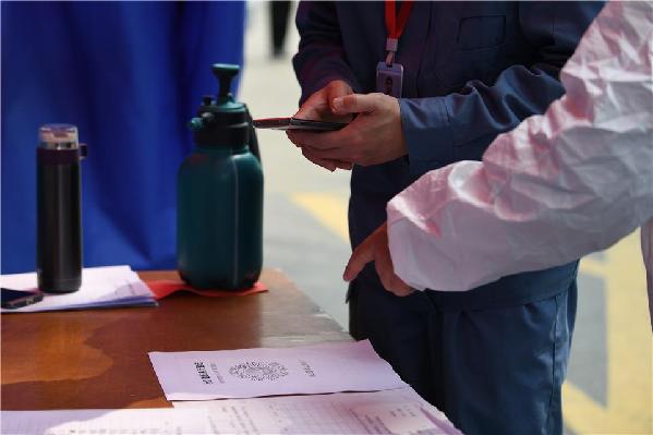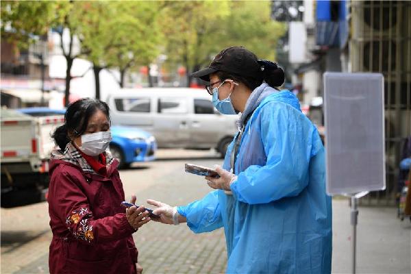 3月23日,武漢市青山區(qū)青山鎮(zhèn)街石化社區(qū),居民通過掃綠碼進(jìn)入小區(qū)。