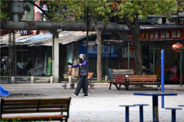 3月23日,武漢市青山區(qū)青山鎮(zhèn)街石化社區(qū),居民在小區(qū)花園內(nèi)鍛煉身體。