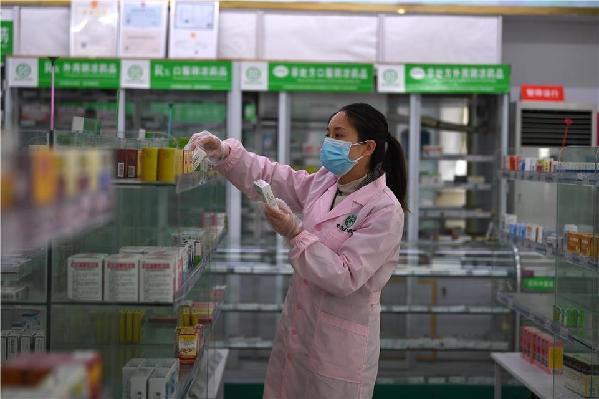 3月23日,武漢市青山區(qū)青山鎮(zhèn)街石化社區(qū)藥店,店員在整理藥品。