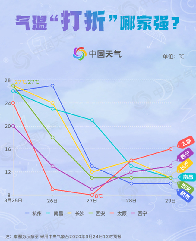 27日,南方大部也將加入降溫的行列,單日降溫幅度沒有北方劇烈,在6-8℃左右,但是累積降溫幅度大,27日開始的兩三天內(nèi),部分地區(qū)也將超過10℃。城市中,杭州最高氣溫累計降幅可達(dá)17℃、南昌降16℃、長沙降15℃、貴陽降14℃、上海降13℃,最高氣溫紛紛降至10℃出頭。29日,江淮、江漢和江南大部最低氣溫也僅有4~9℃。
