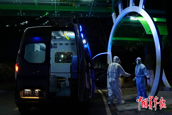 一位發(fā)熱病人被救護車送進金銀潭醫(yī)院,司機對隨行人員進行消殺。