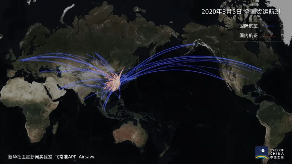 1個月內,中國國內和直飛世界各地的貨運航班快速增多,原有航線航班數(shù)也有增加,標示航線的橘色、藍色線條也就更粗。