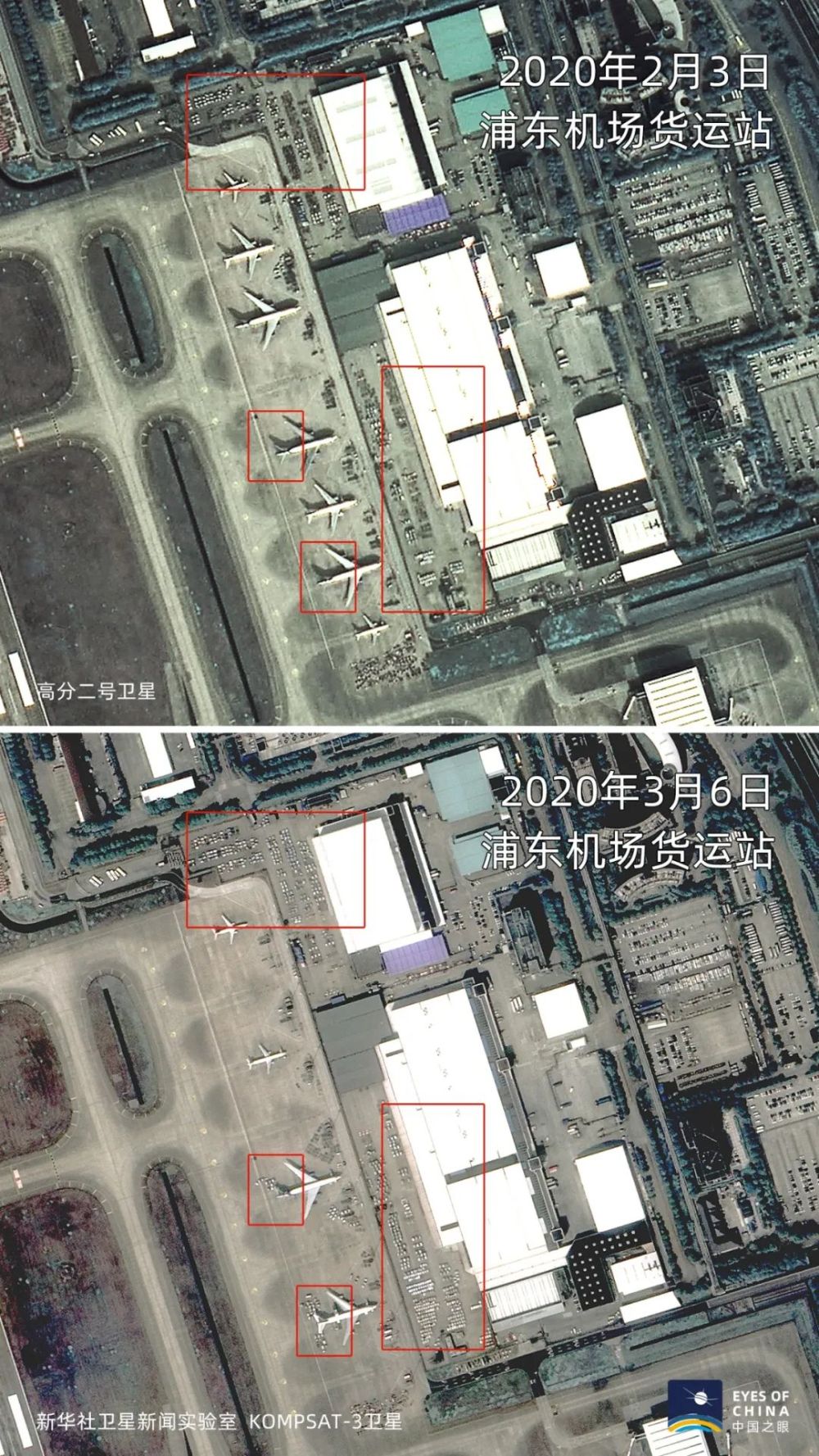 浦東機場貨運站,2月3日多架停放在地面的飛機裝卸貨物跡象不明顯。3月6日,地面停放飛機數(shù)量減少,且多在進行裝卸作業(yè),堆放的貨物也大大增多。