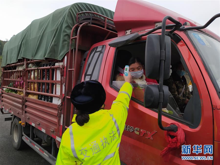 四川省交通運(yùn)輸廳高速公路交通執(zhí)法第五支隊(duì)雅康大隊(duì)隊(duì)長(zhǎng)強(qiáng)薇在雅康高速公路上進(jìn)行防疫檢查(2月1日攝)。 新華社發(fā)