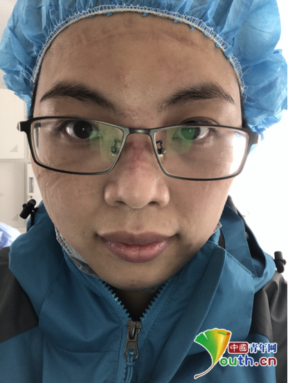 脫下厚重的防護(hù)設(shè)備后,黃春芬的臉頰、額頭滿是壓痕。受訪者供圖