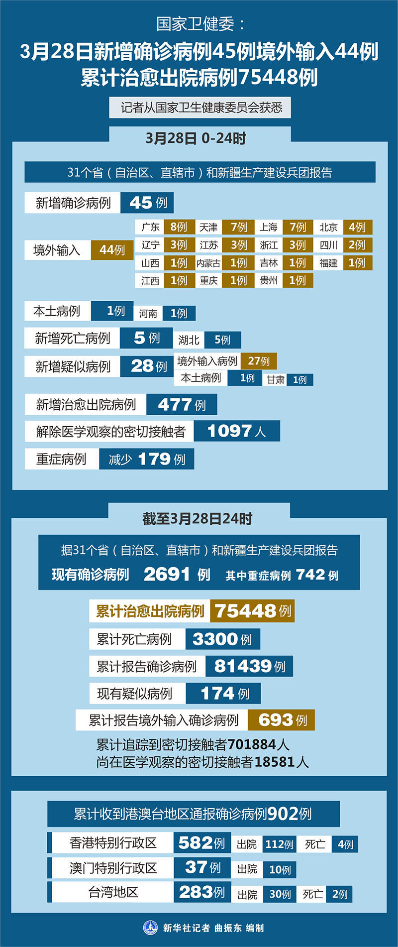 截至3月28日24時,據(jù)31個?。ㄗ灾螀^(qū)、直轄市)和新疆生產(chǎn)建設(shè)兵團(tuán)報告,現(xiàn)有確診病例2691例(其中重癥病例742例),累計治愈出院病例75448例,累計死亡病例3300例,累計報告確診病例81439例,現(xiàn)有疑似病例174例。累計追蹤到密切接觸者701884人,尚在醫(yī)學(xué)觀察的密切接觸者18581人。