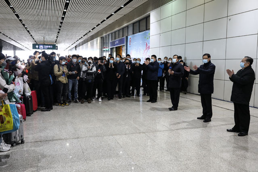 3月28日,武漢火車站,湖北省委書記應(yīng)勇(右二),省委副書記、省長王曉東(右一)等人迎接從廣州南到武漢的G1112次列車乘客。記者 趙迪/攝
