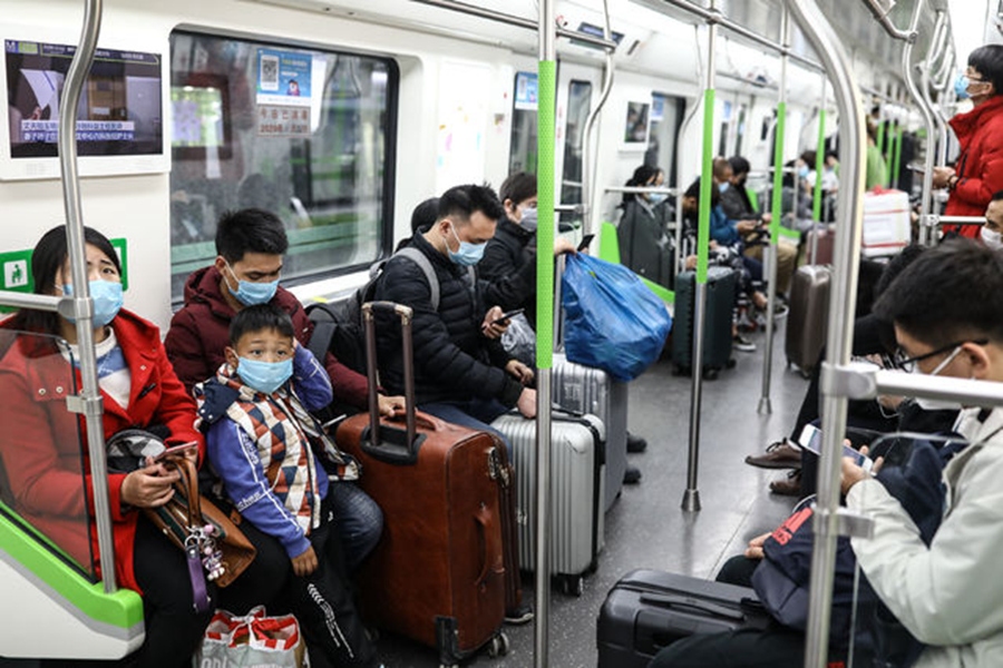 3月28日,武漢地鐵4號線,5歲的劉志皓和父母乘坐地鐵返回家中。他的父親在一家互聯(lián)網(wǎng)公司工作。記者 趙迪/攝