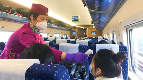 4、測溫:專列內(nèi)幾乎滿座,餐飲等服務(wù)照常進行,乘務(wù)員定時為乘客測量體溫。