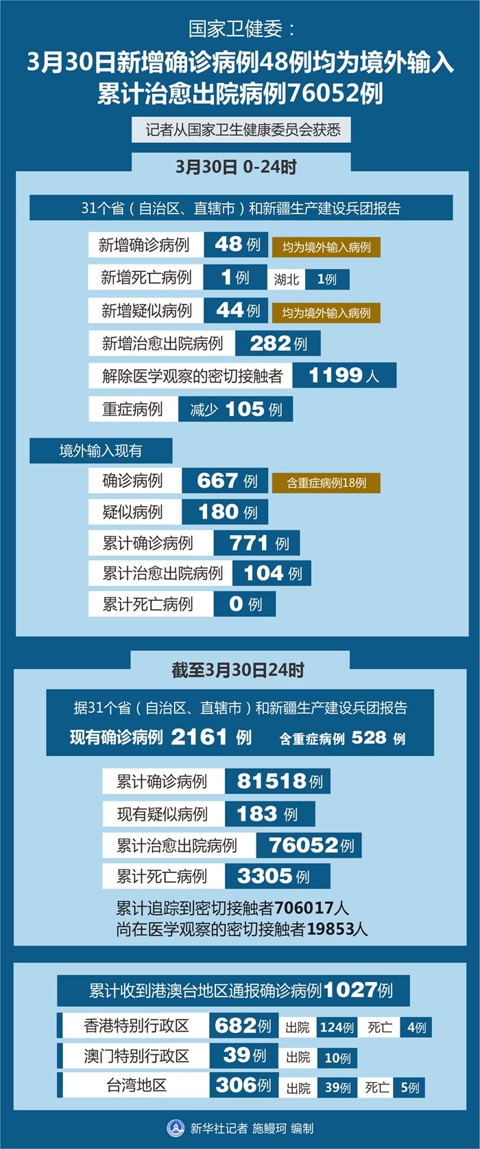 新華社北京3月31日電(記者劉羊旸、王秉陽)記者31日從國(guó)家衛(wèi)生健康委員會(huì)了解到,3月30日0—24時(shí),31個(gè)?。ㄗ灾螀^(qū)、直轄市)和新疆生產(chǎn)建設(shè)兵團(tuán)報(bào)告新增確診病例48例,均為境外輸入病例;新增死亡病例1例(湖北1例);新增疑似病例44例,均為境外輸入病例。