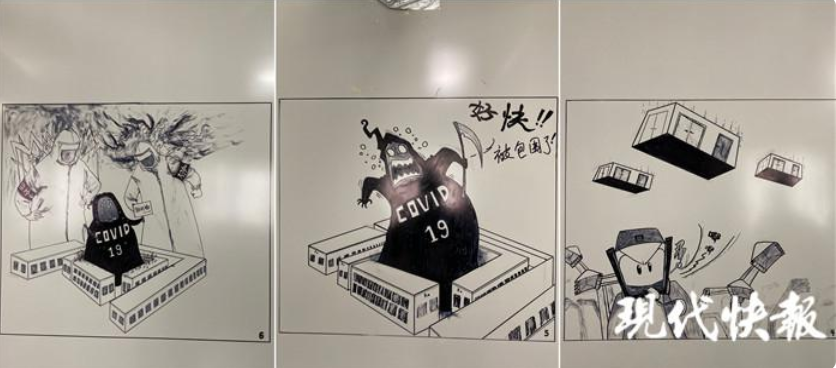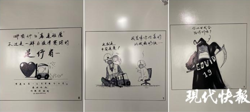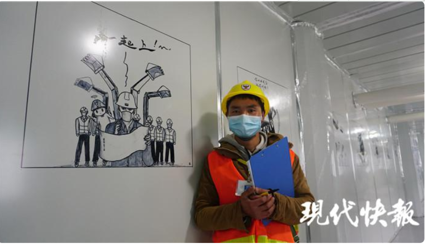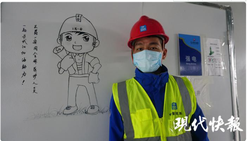 許新焰看到醫(yī)護(hù)人員通道的一面墻空著,就用一組漫畫,把中建三局建設(shè)醫(yī)院對抗 " 疫魔 " 的過程,用9幅漫畫體現(xiàn)出來。" 就是想給醫(yī)護(hù)人員、志愿者和我們這些維保隊(duì)員力量,我們用幾天時(shí)間就把醫(yī)院建起來了,這樣的速度,不怕疫魔。" 他說,每幅漫畫大約需要耗費(fèi)一兩個小時(shí),有時(shí)畫著畫著就要出工,前前后后花了七八天的時(shí)間,才把整組漫畫全部畫完。