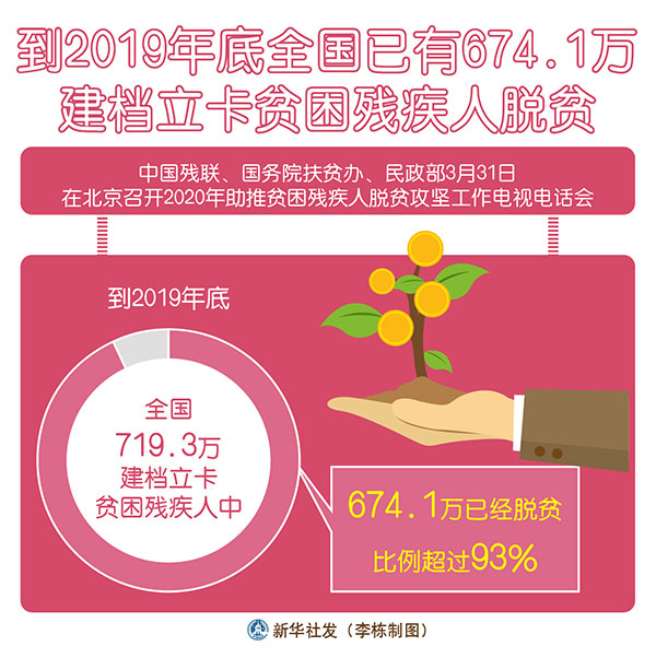 新華社北京3月31日電(記者孫少龍)中國(guó)殘聯(lián)、國(guó)務(wù)院扶貧辦、民政部31日在京召開2020年助推貧困殘疾人脫貧攻堅(jiān)工作電視電話會(huì)。記者從會(huì)上了解到,到2019年底,全國(guó)719.3萬(wàn)建檔立卡貧困殘疾人中,674.1萬(wàn)已經(jīng)脫貧,比例超過93%。