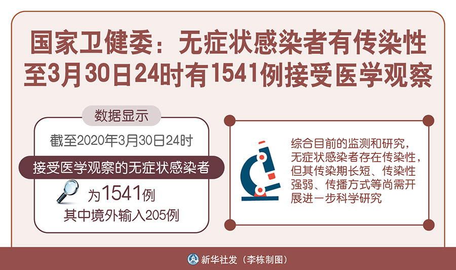 新華社北京3月31日電(記者王秉陽)國家衛(wèi)健委31日在官網(wǎng)發(fā)布《關(guān)于新型冠狀病毒無癥狀感染者的防控工作答問》,對近來網(wǎng)民熱議的無癥狀感染者相關(guān)問題進(jìn)行回答。數(shù)據(jù)顯示,截至2020年3月30日24時,接受醫(yī)學(xué)觀察的無癥狀感染者為1541例,其中境外輸入205例。
