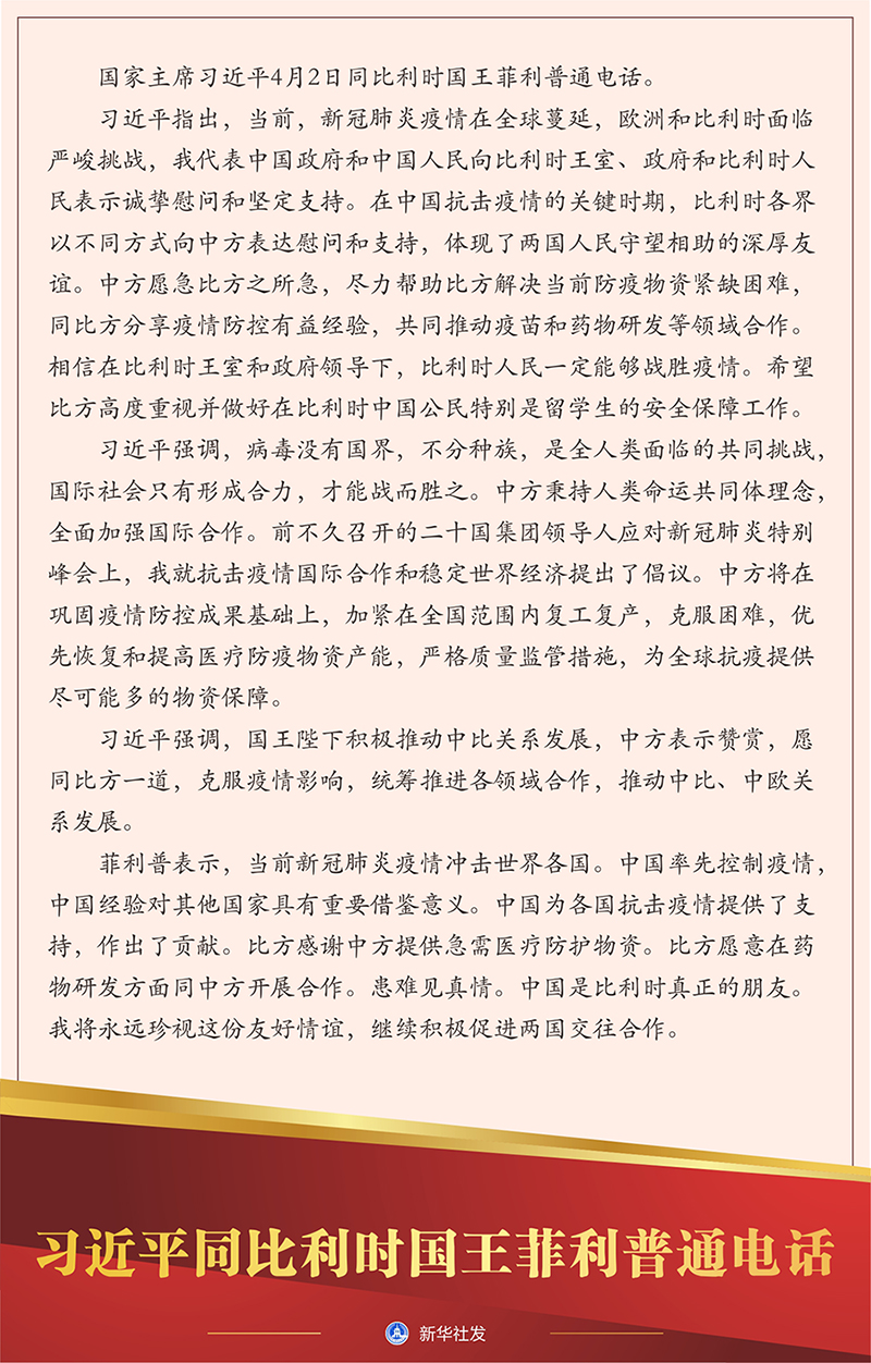新華社北京4月2日電 國(guó)家主席習(xí)近平2日同比利時(shí)國(guó)王菲利普通電話(huà)。