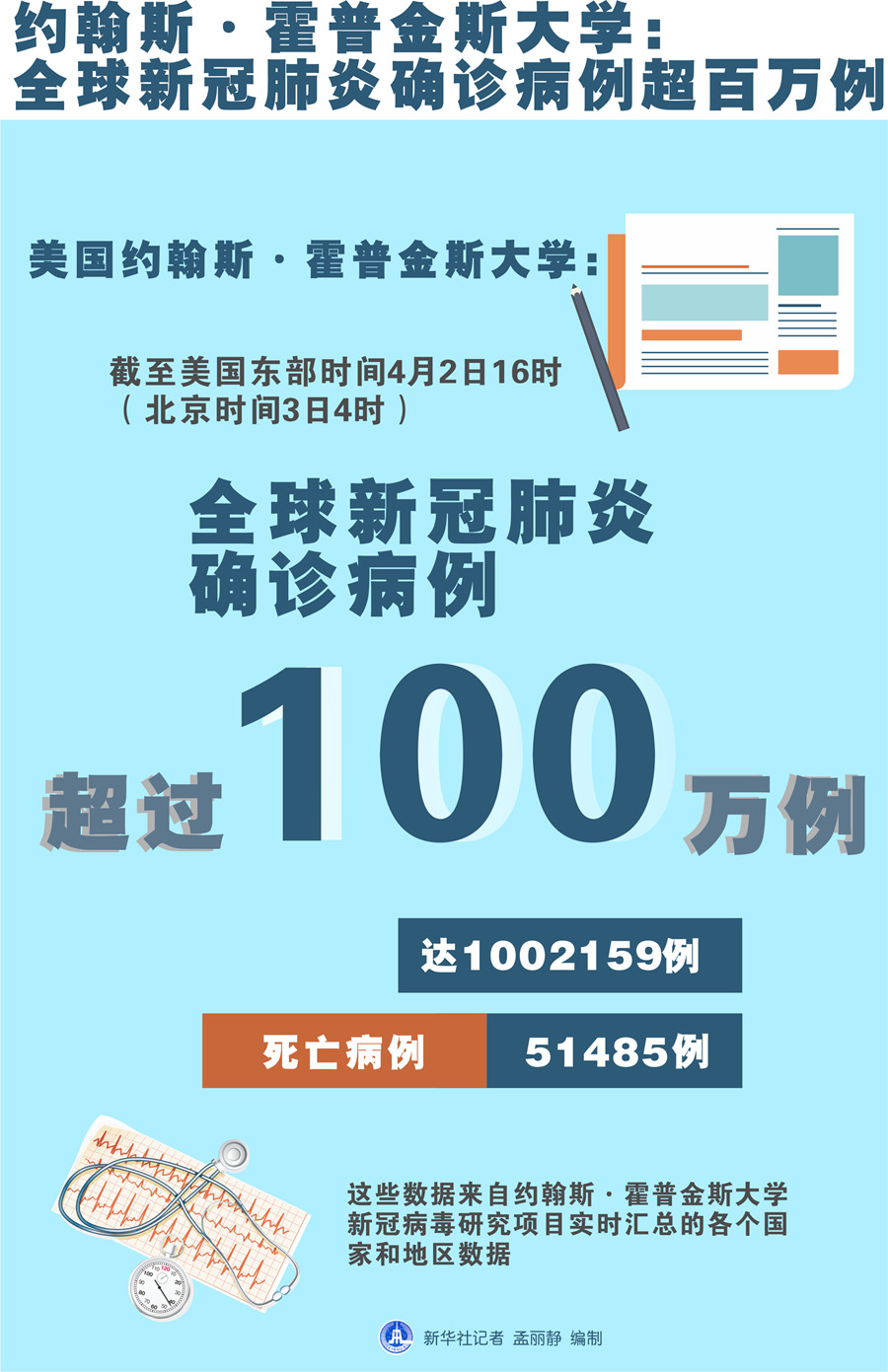 美國約翰斯·霍普金斯大學(xué):截至美國東部時間2日16時(北京時間3日4時),全球確診病例達1002159例,死亡病例為51485例。美國確診病例增至236339例,是目前確診病例最多的國家,其死亡病例為5648例。