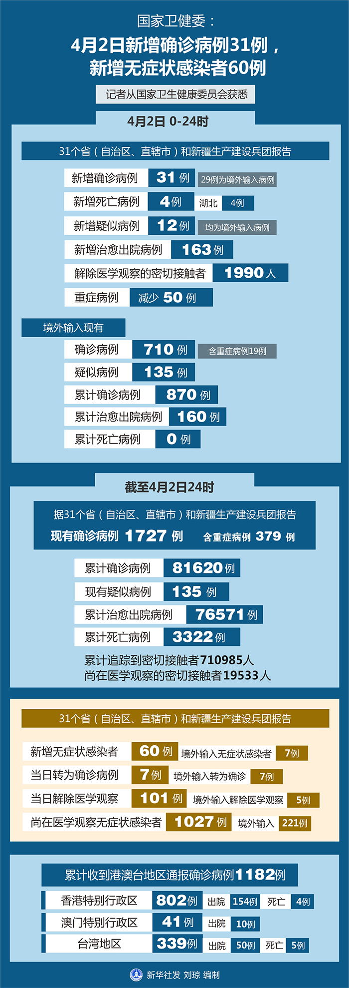 截至4月2日24時(shí),據(jù)31個(gè)?。ㄗ灾螀^(qū)、直轄市)和新疆生產(chǎn)建設(shè)兵團(tuán)報(bào)告,現(xiàn)有確診病例1727例(其中重癥病例379例),累計(jì)治愈出院病例76571例,累計(jì)死亡病例3322例,累計(jì)報(bào)告確診病例81620例,現(xiàn)有疑似病例135例。累計(jì)追蹤到密切接觸者710985人,尚在醫(yī)學(xué)觀察的密切接觸者19533人。
