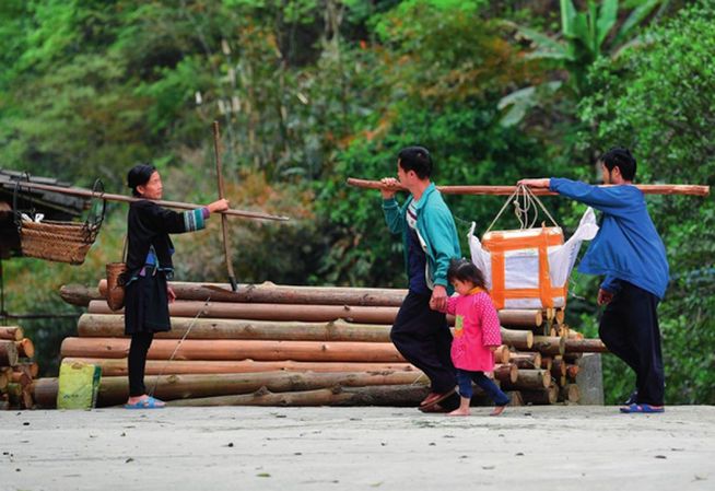 3月25日,桂黔烏英苗寨,村民抬著廣西融水苗族自治縣扶貧部門送來的螺苗,準(zhǔn)備投放 黃孝邦攝/本刊