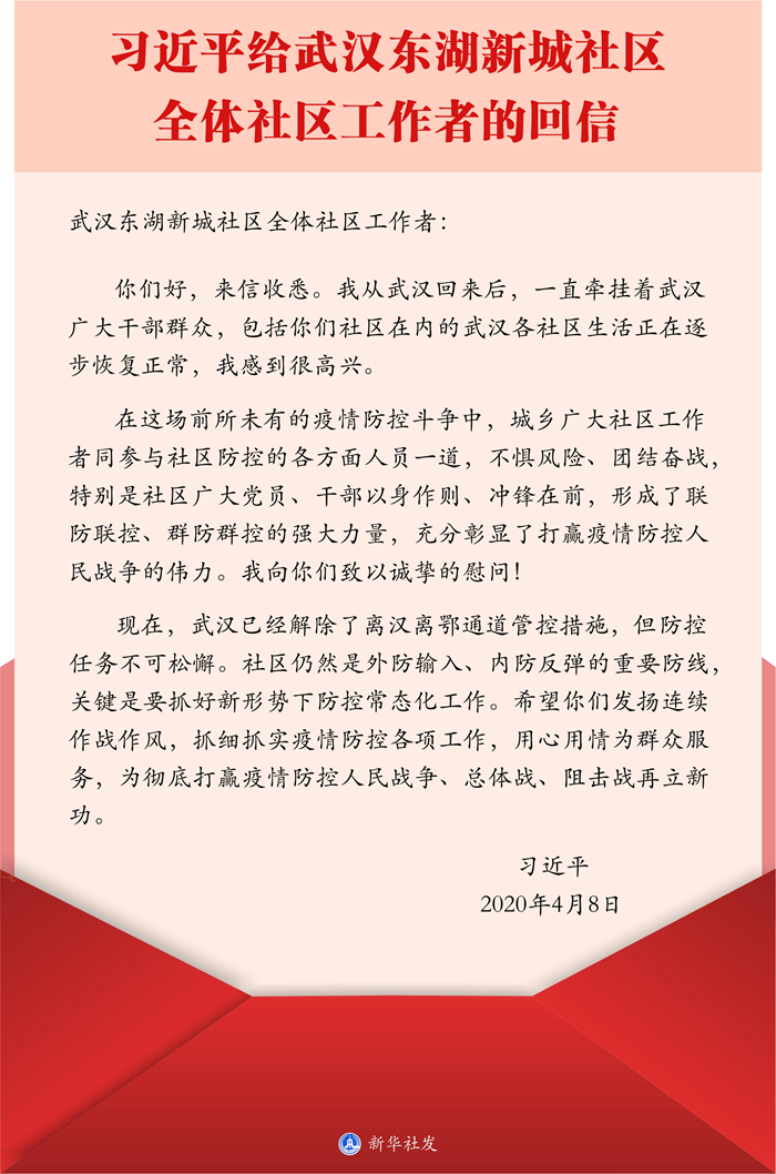 新華社北京4月9日電 中共中央總書記、國(guó)家主席、中央軍委主席習(xí)近平4月8日給武漢市東湖新城社區(qū)全體社區(qū)工作者回信,再次肯定城鄉(xiāng)廣大社區(qū)工作者在疫情防控斗爭(zhēng)中發(fā)揮的重要作用,向他們致以誠(chéng)摯的慰問,并勉勵(lì)他們?yōu)閺氐状蜈A疫情防控人民戰(zhàn)爭(zhēng)、總體戰(zhàn)、阻擊戰(zhàn)再立新功。
