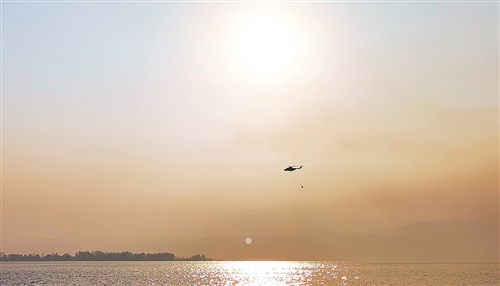為撲救四川西昌森林火災(zāi),救援直升機(jī)在西昌邛海取水。 新華社發(fā)