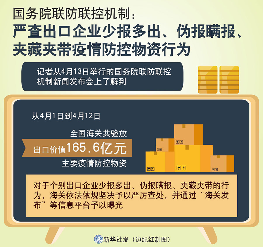 新華社北京4月13日電(記者屈婷、王鵬)記者從13日舉行的國務(wù)院聯(lián)防聯(lián)控機(jī)制新聞發(fā)布會上了解到,從4月1日到4月12日,全國海關(guān)共驗(yàn)放出口價值165.6億元的主要疫情防控物資,對個別出口企業(yè)少報多出、偽報瞞報、夾藏夾帶的行為,依法依規(guī)予以嚴(yán)厲查處。