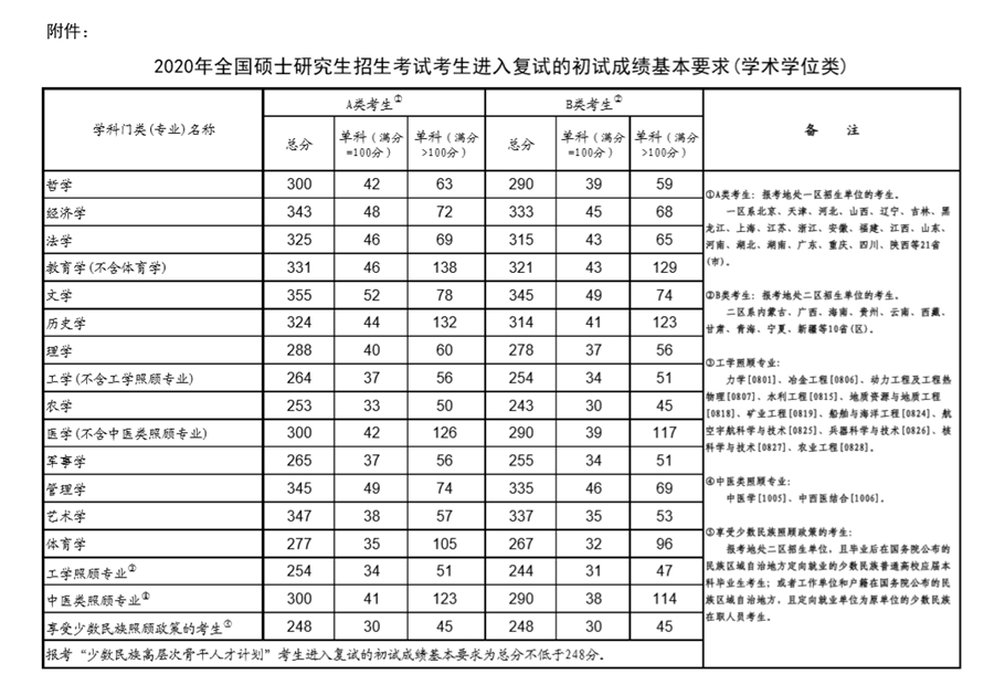 附件:2020年全國碩士研究生招生考試考生進入復(fù)試的初試成績基本要求
