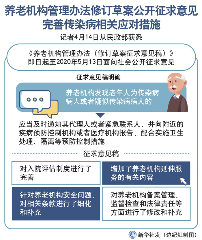 新華社北京4月14日電(記者孫少龍)記者14日從民政部獲悉,《養(yǎng)老機(jī)構(gòu)管理辦法(修訂草案征求意見稿)》即日起至2020年5月13日面向社會公開征求意見,結(jié)合新冠肺炎疫情防控要求,征求意見稿依法完善了養(yǎng)老機(jī)構(gòu)發(fā)現(xiàn)老年人為傳染病病人或者疑似傳染病病人時的應(yīng)對措施。