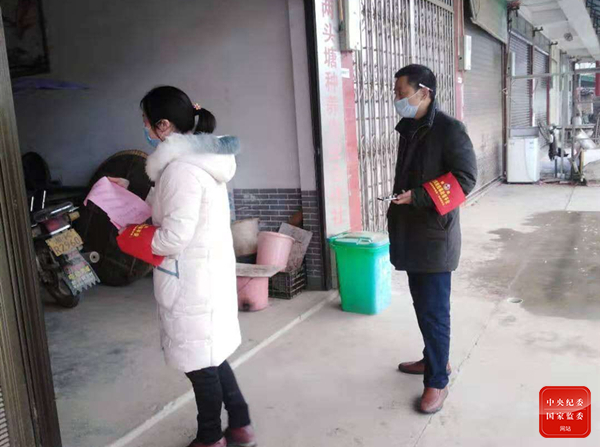 2月11日,向衛(wèi)煌和荷葉鎮(zhèn)兩頭塘村村干部上門(mén)向村民發(fā)放宣傳單,宣傳疫情防控知識(shí)。