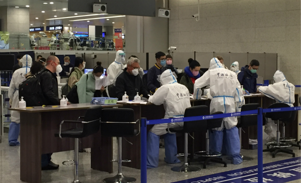 海關(guān)關(guān)員在上海浦東國際機(jī)場對(duì)入境旅客進(jìn)行流行病學(xué)調(diào)查。新華社發(fā)(吳宇 攝)